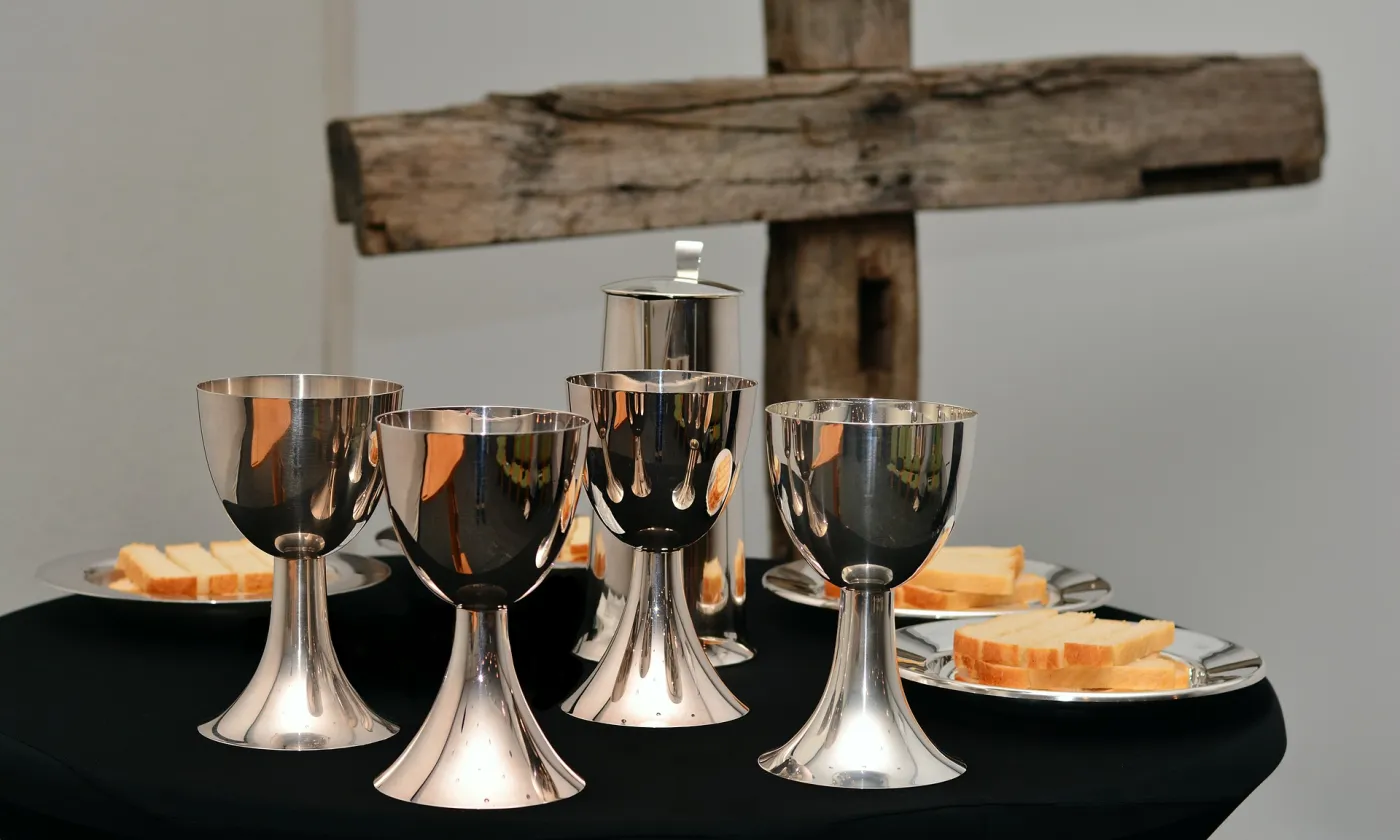 L’origine biblique de l’Eucharistie remonte au dernier repas de Jésus, qu’il a partagé avec ses douze apôtres, le soir du Jeudi saint, la veille de sa crucifixion. Dans la Bible, l’institution de l’Eucharistie est décrite dans les trois évangiles synoptiques (Matthieu 26.26-29; Marc 14.22-25; Luc 22.15-20) et dans la première lettre aux Corinthiens (11.23-26). Dans l’évangile de Matthieu, il est écrit: «Pendant le repas, Jésus prit du pain et, après avoir prononcé la bénédiction, il le rompit; puis, le donnant aux disciples, il dit: «Prenez, mangez, ceci est mon corps.» Puis il prit une coupe et, après avoir rendu grâce, il la leur donna en disant: «Buvez-en tous, car ceci est mon sang […] » (26.26-28 TOB). Ces actes sont interprétés différemment par les protestants et les catholiques. Dans le protestantisme, le pain et le vin sont des symboles. «J’ai le sentiment que c’est un repas qui restaure nos forces par le pain et notre joie par le vin. Quand je célèbre, j’insiste sur le fait que cette cérémonie nous fortifie intérieurement, mais c’est une nourriture spirituelle», raconte le pasteur Virgile Rochat. D’ailleurs en choisissant du chasselas, donc du blanc, «nous nous distancions du sang du Christ», ajoute Marie-Noëlle Genton Bonzon. Au contraire, dans le catholicisme, la transsubstantiation transforme «réellement et matériellement» le pain et le vin en corps et sang du Christ.