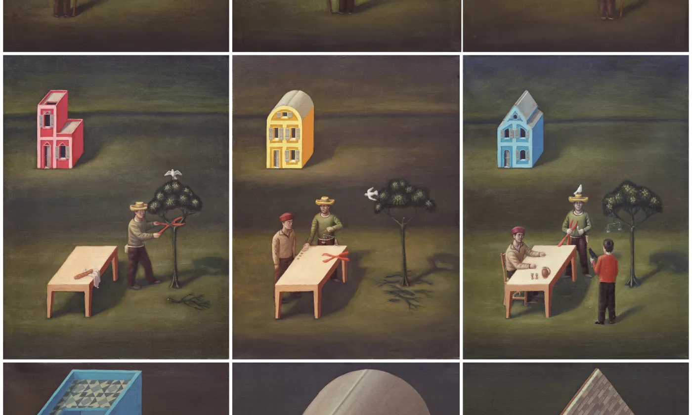 J’ai travaillé avec les trois couleurs primaires et trois formes simples: rectangulaire, ronde et triangulaire. J’ai organisé les couleurs selon des diagonales et les formes selon des lignes verticales. J’ai élaboré des plans précis et des esquisses en amont. Une autre forme de créativité intervient ensuite dans les détails, comme les gestes des personnages. Par exemple, l’olivier est apparu plus tard, une image forte de la vie spirituelle, symbolisant le vide et l’élargissement de la conscience.