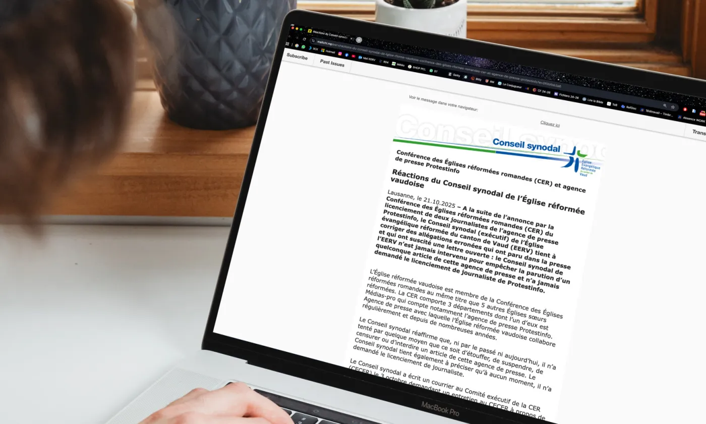 Lausanne, le 21 octobre 2025 – A la suite de l’annonce par la Conférence des Églises réformées romandes (CER) du licenciement de deux journalistes de l’agence de presse Protestinfo, le Conseil synodal (exécutif) de l’Église évangélique réformée du canton de Vaud (EERV) tient à corriger des allégations erronées qui ont paru dans la presse et qui ont suscité une lettre ouverte: le Conseil synodal de l’EERV n’est jamais intervenu pour empêcher la parution d’un quelconque article de cette agence de presse et n’a jamais demandé le licenciement de journaliste de Protestinfo.
